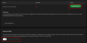 You will then see your domain name and an option to Activate Free SSL next to it – select this, and the SSL will be applied to your domain.